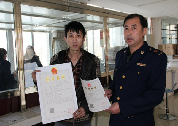 区市场监管局常务局长张国辉向抚顺市装饰有限公司负责人发放全区首张“三证合一”营业执照