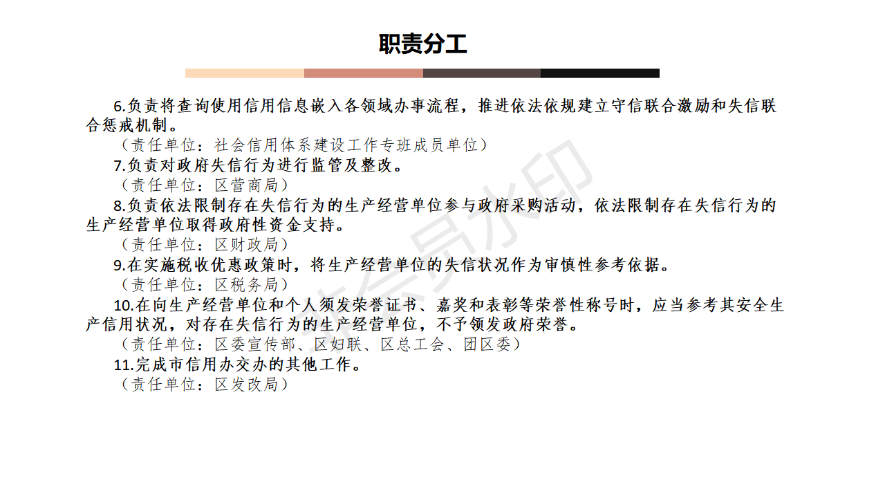 8.负责依法限制存在失信行为的生产经营单位参与政府采购活动,依法限制存在失信行为的生产经营单位取得政府性资金支持。(责任单位:区财政局)