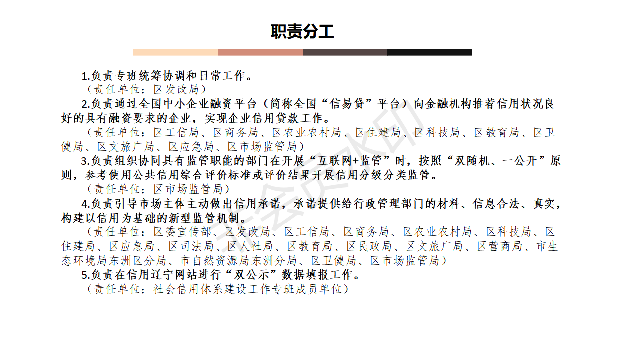 5.负责在信用辽宁网站进行“双公示”数据填报工作。(责任单位:社会信用体系建设工作专班成员单位)