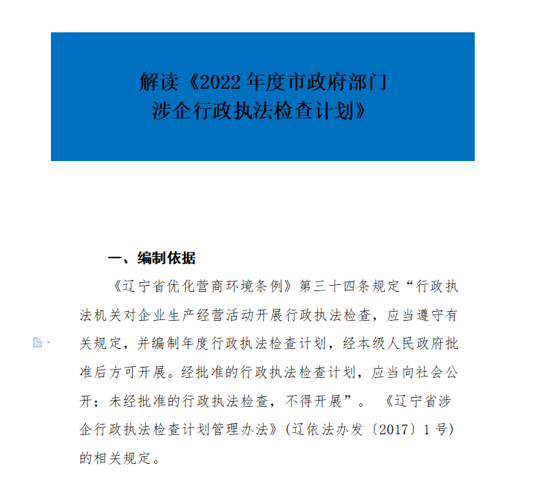 为认真贯彻《辽宁省优化营商环境条例》和《辽宁省涉企行政执法检查计划管理办法》,现将《抚顺市人民政府办公室关于印发2022年度市政府部门涉企行政执法检查计划的通知》转发给你们,请严格按照计划认真贯彻执行。