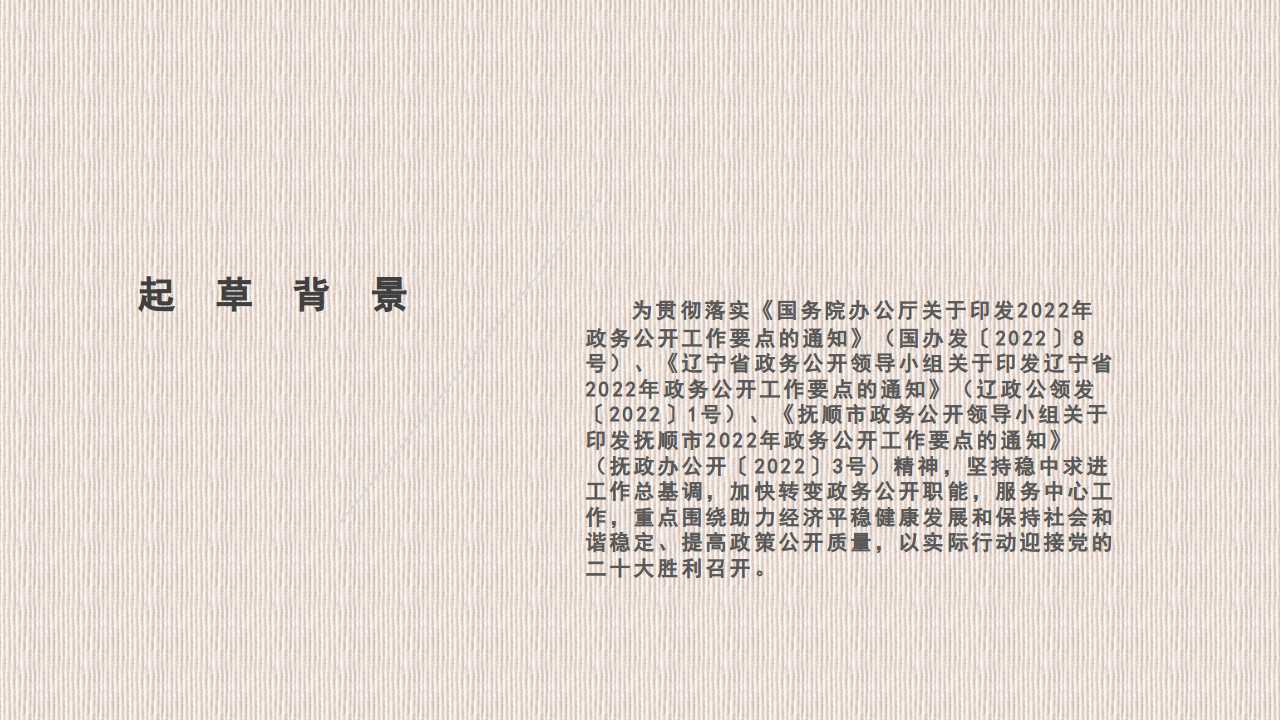 2022年政务公开工作要点的通知》(抚政办公开〔2022〕3号)精神,根据上级工作安排,坚持稳中求进工作总基调,加快转变政务公开职能,服务中心工作,重点围绕助力经济平稳健康发展和保持社会和谐稳定、提高政策公开质量,以实际行动迎接党的二十大胜利召开。