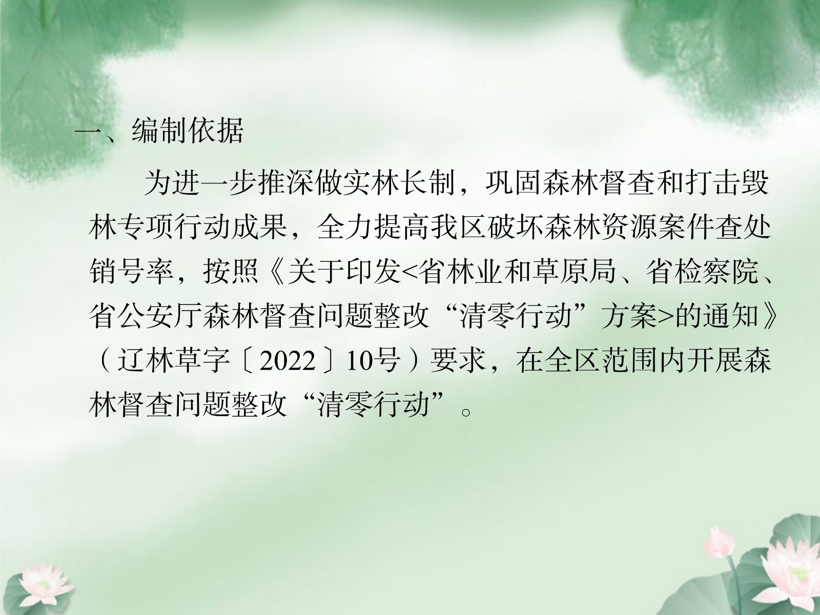 为进一步推深做实林长制,巩固森林督查和打击毁林专项行动成果,全力提高我区破坏森林资源案件查处销号率,按照《关于印发<省林业和草原局、省检察院、省公安厅森林督查问题整改“清零行动”方案>的通知》(辽林草字〔2022〕10号)要求,决定在全区范围内开展森林督查问题整改“清零行动”(以下简称“清零