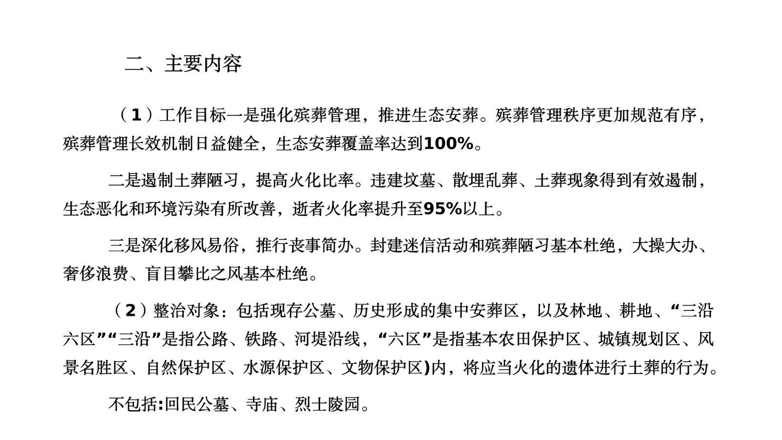 (二)遏制土葬陋习,提高火化比率。违建坟墓、散埋乱葬、土葬现象得到有效遏制,生态恶化和环境污染有所改善,逝者火化率提升至95%以上。