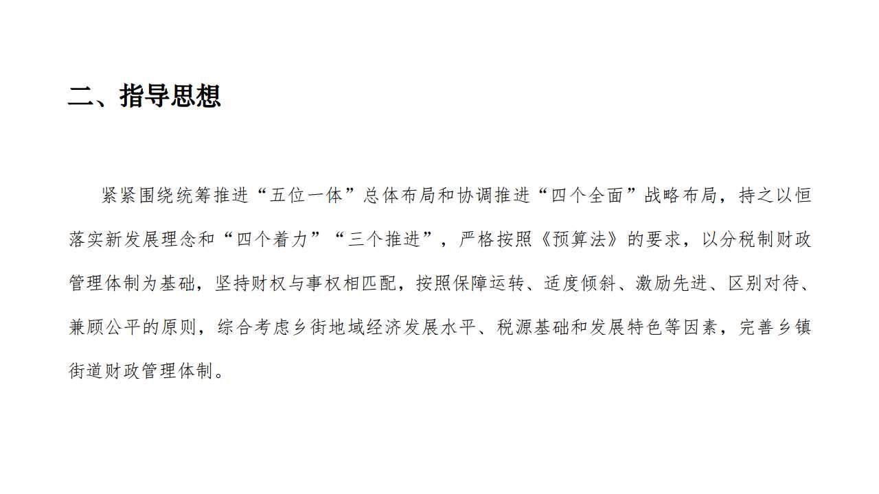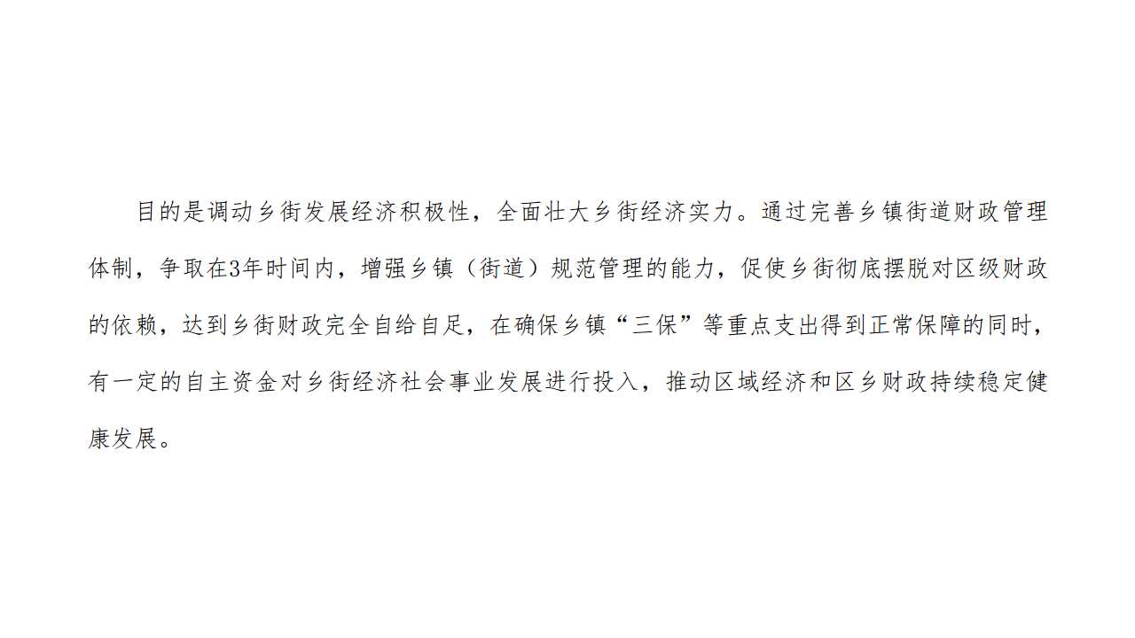 紧紧围绕统筹推进“五位一体”总体布局和协调推进“四个全面”战略布局,持之以恒落实新发展理念和“四个着力”“三个推进”,严格按照《预算法》的要求,以分税制财政管理体制为基础,坚持财权与事权相匹配,按照保障运转、适度倾斜、激励先进、区别对待、兼顾公平的原则,综合考虑乡街地域经济发展水平、税源基础和发展特色等因素,完善乡镇街道财政管理体制。目的是调动乡街发展经济积极性,全面壮大乡街经济实力。通过完善乡镇街道财政管理体制,争取在3年时间内,增强乡镇(街道)规范管理的能力,促使乡街彻底摆脱对区级财政的依赖,达到乡街财政完全自给自足,在确保乡镇“三保”等重点支出得到正常保障的同时,有一定的自主资金对乡街经济社会事业发展进行投入,推动区域经济和区乡财政持续稳定健康发展。