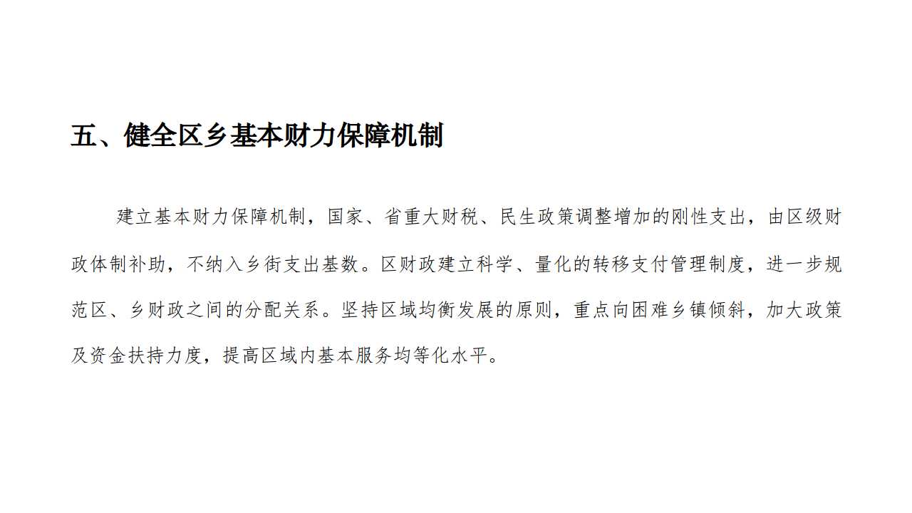 建立基本财力保障机制,国家、省重大财税、民生政策调整增加的刚性支出,由区级财政体制补助,不纳入乡街支出基数。区财政建立科学、量化的转移支付管理制度,进一步规范区、乡财政之间的分配关系。坚持区域均衡发展的原则,重点向困难乡镇倾斜,加大政策及资金扶持力度,提高区域内基本服务均等化水平。