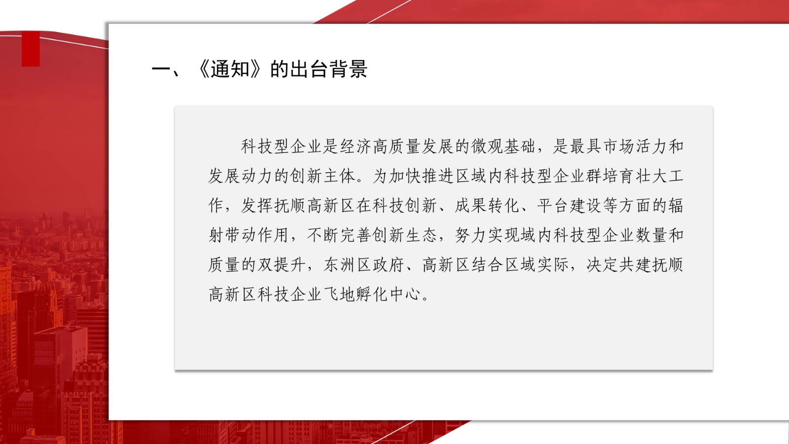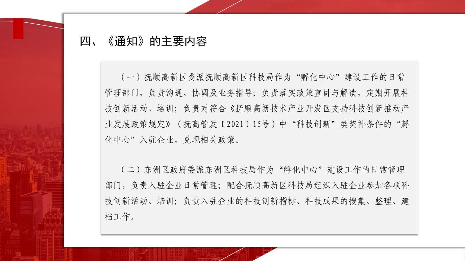 (一)抚顺高新区委派抚顺高新区科技局作为“孵化中心”建设工作的日常管理部门,负责沟通、协调及业务指导;负责落实政策宣讲与解读,定期开展科技创新活动、培训;负责对符合《抚顺高新技术产业开发区支持科技创新推动产业发展政策规定》(抚高管发〔2021〕15号)中“科技创新”类奖补条件的“孵化中心”入驻企业,兑现相关政策。